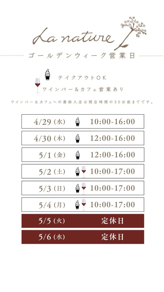 ソフトクリーム、ワインバー、カフェの営業時間は以下をご確認ください。